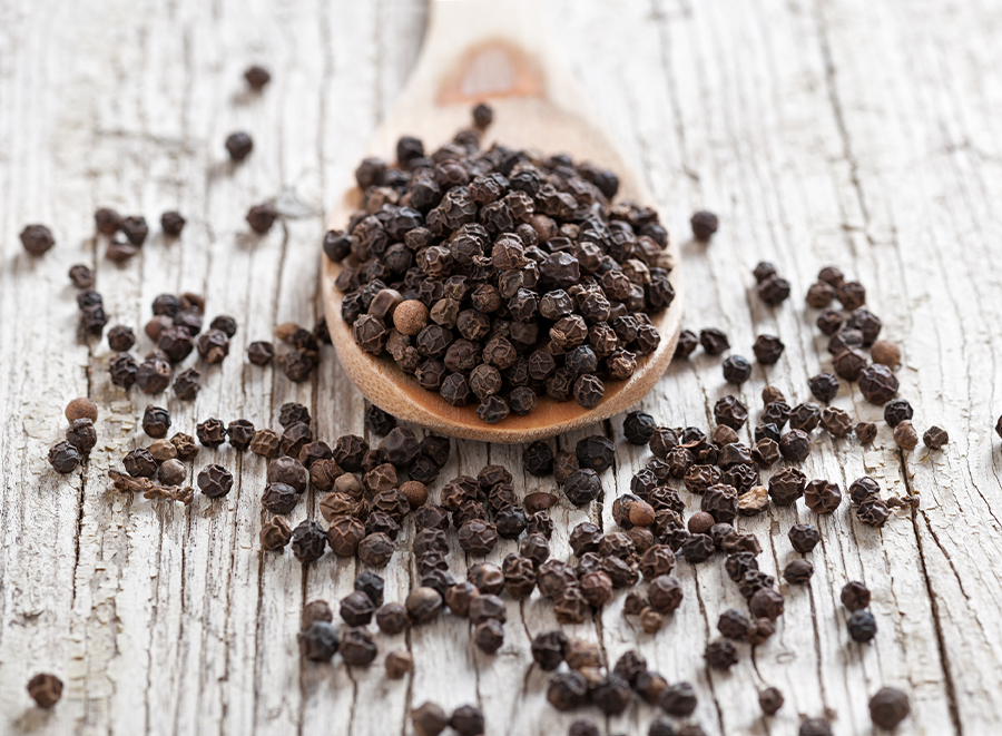 採收接近成熟的果實,經過乾燥後外皮變黑,形成具有濃郁辛香的黑胡椒。它的味道辛辣濃烈,常用於烹飪中作為基本調味料,可以增強食材的風味。黑胡椒廣泛用於醬汁、湯品、燒烤、肉類及蔬菜料理,尤其在西餐中扮演不可或缺的角色。